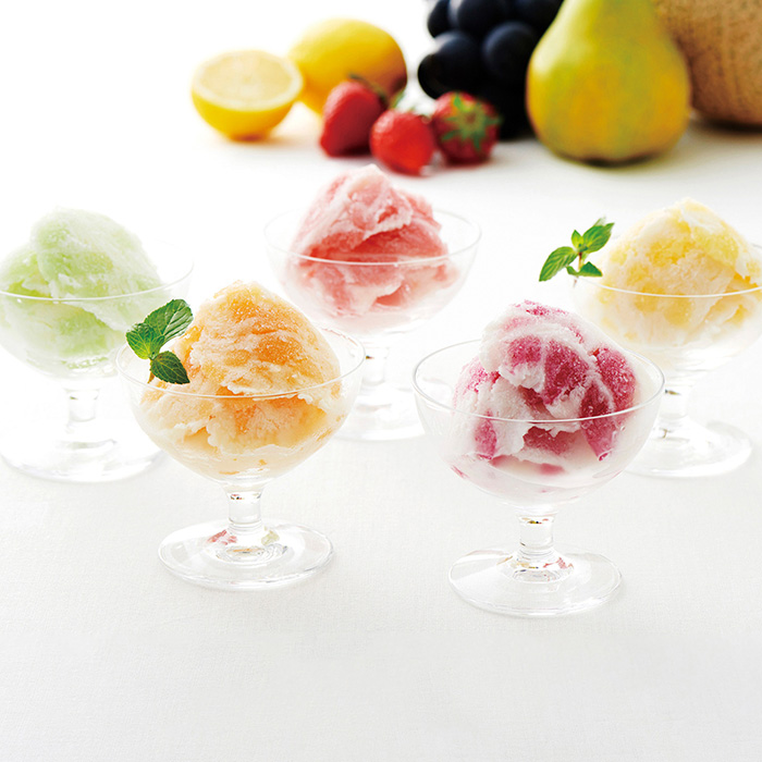 岡山産の4種類のフルーツである清水白桃・ニューピオーネ・黄金桃・マスカットを贅沢にすりつぶして仕上げたゼリーの詰め合わせです。冷凍庫で凍らせてシャーベトにしても。