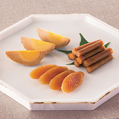 純米大吟醸の酒粕・味醂粕で漬け込んだ守口大根の奈良漬・守口漬と、岡崎名産八丁味噌で漬け込んだごぼう、卵はコクがありながら、後口のすっきりした味わい深いお漬物です。