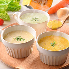 もっちりとした粘りのある蓮根のポタージュ、甘みと粗く刻まれた食感が楽しいとうもろこしのポタージュ、こだわりのカット方法で芳醇な香りを引き出すかぼちゃのスープをセットでお届けします。野菜と果物を混ぜ合わせた麹入りスムージーを作る技術を活かし、それぞれのスープ・ポタージュには34種類のお野菜と麹入り。常温保存できるパウチなので、忙しい時や食欲のない時でも手軽にお召し上がりいただけます。