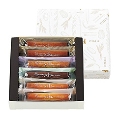 仕合わせをつなぐ、バトンの形をした風味豊かなスティックケーキ。芳醇なバターとアーモンドの上品な「プレーン」、アールグレイ茶葉を入れた「紅茶」、ホロ苦い味わいの「ショコラ」、甘く芳しい塩キャラメルを生地に閉じ込めた「キャラメル」の4種類を各3本、合計12本入です 。