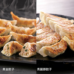 「黄金餃子」は、地元農家が育てた食材と、調味料にもこだわり抜いて完成させた、まさに看板商品。「秀麗豚(しゅうれいとん)餃子」は、銘柄ポーク好感度コンテストで最優秀賞を受賞した秀麗豚を100%使用。地産地消の国産素材でつくる餃子が人気の餃子セットです。