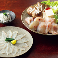 鮮度の良い国産の天然とらふぐの身を、下関の調理師が1枚1枚ていねいに大皿に盛りつけ、きれいな花のように美しく仕上げました。見た目にも贅沢なふぐ刺しを、豪快にお召しあがりください。「日本の極み」TOPへ