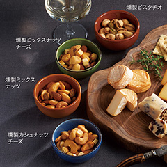 木製の燻製窯で、5種類のオリジナルブレンドチップと使って、燻したナッツを4種セットでお届けします。お酒のお供にはもちろん、サラダやカレーのトッピングとしてお召し上がりいただくのもおすすめです。