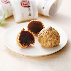 お菓子の老舗〈五勝手屋本舗〉の新感覚和菓子「回/Re-Fruit」。干して水分が抜けて平たくなったドライいちじくに、あっさりした味わいの「金時豆」のようかんをぎっしり詰めて、もとの立体的な姿をよみがえらせたユニークなお菓子です。