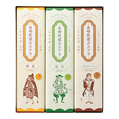原料を吟味し、独自の技術で焼きあげたカステラ。蜂蜜、抹茶、チョコレートの3 つの味が食べやすい大きさにカットされています。