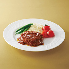 松阪牛を使用したハンバーグをデミグラスソースで煮込みました。本格的な味をお楽しみいただけます。