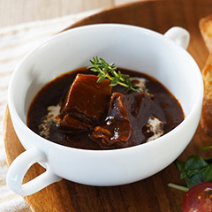 じっくりと煮込まれた牛すじが、口の中でとろけるような食感を生み出すコク深いビーフシチューです。濃厚で心温まるような一品をお召し上がりください。