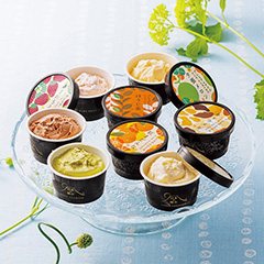 人気の素材を使ったアイスクリームセットです。フレーバーは「チョコレート」・「バニラ」・「あまおうミルク」・「夕張メロン」・「紅まどんな」・「キャラメル」・「宇治抹茶」・「ほうじ茶」の8種類。濃厚でいて後味のいいアイスクリームをお楽しみください。