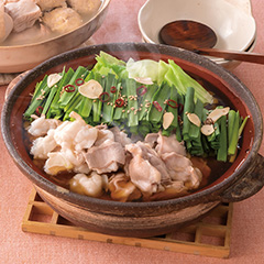 水炊き料亭〈博多華味鳥〉のもつ鍋は、九州産銘柄鶏「華味鳥」のハラミと牛小腸とを組み合わせたオリジナル。醤油味のもつ鍋スープとも相性がよく、食べやすくてボリューム感のあるセットです。
