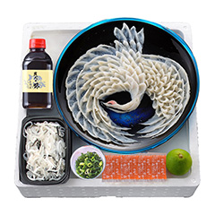 ふぐの本場、山口県下関でふぐを中心に食品の製造・販売を行う〈関とら本店〉。とらふぐの刺身をまるで今にも飛び立つかのような鶴のように盛り合わせた、縁起の良い一品です。透き通ったふぐの刺身には職人の技が光ります。ふぐの身にある甘み、旨み成分を引き立たせるよう作られたポン酢をかけてお召し上がりください。
