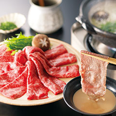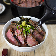 味噌と昆布塩で味付けした3種の銘柄牛肉と、食欲をそそられる甘口のタレと〆の出汁がついたひつまぶしのセットです。濃厚な旨みのモモ肉とタレの旨みを楽しんだ後は、出汁をかけお茶漬けにしてお召し上がりください。
