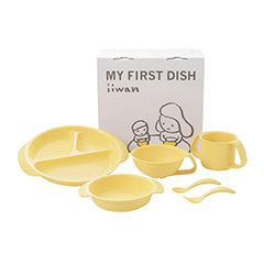 産業用に栽培されるデントコーンという品種のトウモロコシのでんぷん(糖)に乳酸菌を加えてできる「ポリ乳酸」で作られた食器セットです。食器はすべて曲線デザインで角がなく、すべすべの手触りです。離乳食初期から幼児食まで段階的に使えるお皿4点とスプーン・フォークを含む6点セットになっています。食器のカラーにはそれぞれ意味が込められており、イエローは元気で明るく、いつまでも笑顔でいられる子になって欲しいという想いが込められています。