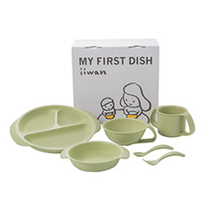 産業用に栽培されるデントコーンという品種のトウモロコシのでんぷん(糖)に乳酸菌を加えてできる「ポリ乳酸」で作られた食器セットです。食器はすべて曲線デザインで角がなく、すべすべの手触りです。離乳食初期から幼児食まで段階的に使えるお皿4点とスプーン・フォークを含む6点セットになっています。食器のカラーにはそれぞれ意味が込められており、グリーンはすこやかにいきいきと、自然を感じて育ってほしいという想いが込められています。