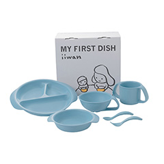 産業用に栽培されるデントコーンという品種のトウモロコシのでんぷん(糖)に乳酸菌を加えてできる「ポリ乳酸」で作られた食器セットです。食器はすべて曲線デザインで角がなく、すべすべの手触りです。離乳食初期から幼児食まで段階的に使えるお皿4点とスプーン・フォークを含む6点セットになっています。食器のカラーにはそれぞれ意味が込められており、ブルーは空のように広い心で、海のような深い思いやりをもって強くやさしく育ってほしいという想いが込められています。