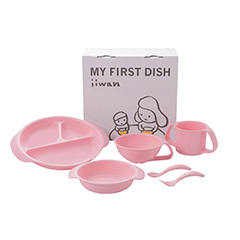 産業用に栽培されるデントコーンという品種のトウモロコシのでんぷん(糖)に乳酸菌を加えてできる「ポリ乳酸」で作られた食器セットです。食器はすべて曲線デザインで角がなく、すべすべの手触りです。離乳食初期から幼児食まで段階的に使えるお皿4点とスプーン・フォークを含む6点セットになっています。食器のカラーにはそれぞれ意味が込められており、ピンクはやさしくしなやかに愛を感じて育ってほしいという想いが込められています。