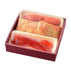昭和21年創業、新潟の魅力あふれる、美しき日本料理を提供する〈料亭かも川本館〉。越後味噌の旨みを存分に漬けこませ、ふっくらとジューシィな味わいの「佐渡サーモンの味噌漬」、味わい深い「塩たらこ」、まろやかでくせのない塩味がおいしい「筋子の塩漬け」の3色セットです。