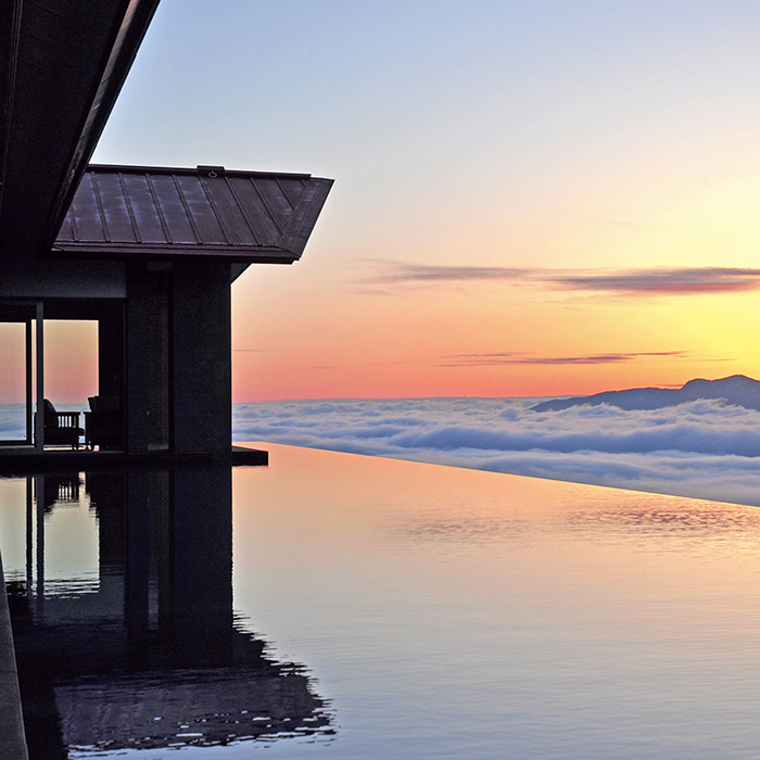 創業は昭和12年。当時の大倉財閥により創業された高原リゾート〈赤倉観光ホテル〉。標高1000メートルからのさえぎるもののない絶景が自慢の宿です。なかでも「SPA& SUITE」棟最上階のアクアテラスや、露天風呂付きの大浴場からの眺望は感動的。江戸時代に開湯された歴史ある赤倉温泉の、源泉かけ流しの良質なお湯を堪能できます。上質なくつろぎを届けるハイグレードでシックな客室、焼きたてのパンや地元の食材を取り入れた朝食も好評です。