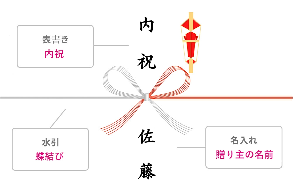 内祝いののしは「紅白5本」の水引を選びます。お祝いの内容により結び方が異なり、結婚内祝いの場合は「結び切り」もしくは「あわじ結び」、新築内祝いや出産内祝いの場合は「蝶結び」を選びます。表書きは「内祝」、名入れは贈り主さまの苗字を入れます。