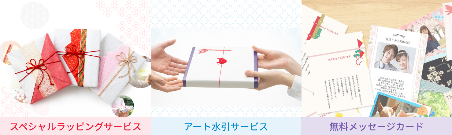 リンベルではギフトを華やかに彩る「アート水引サービス」や「スペシャルラッピングサービス」、感謝の気持ちを伝える「無料メッセージカード」など、リンベルでは、ギフトに関するさまざまなサービスをご提供しています。