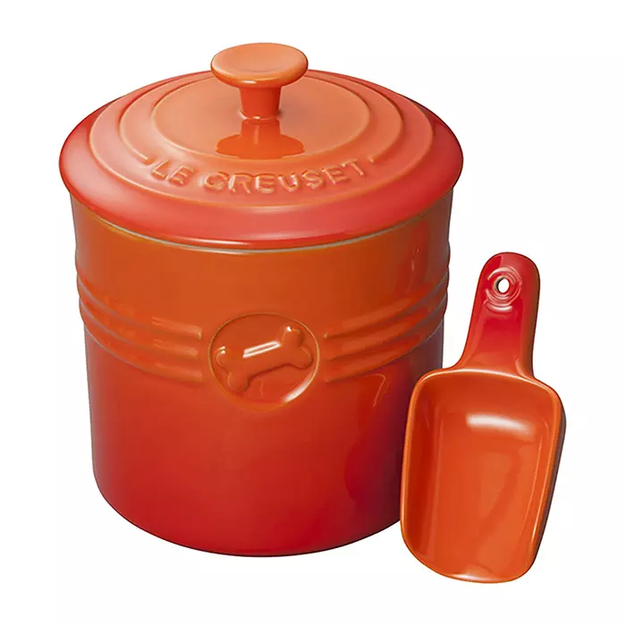 ドライフードを保存できるペットフード・コンテナー。鮮やかなオレンジ色とお洒落な形は、世界中で愛されるキッチンウェア〈ル・クルーゼ〉ならではのデザインです。密閉性のあるフタなので、トリーツ入れにもおススメ。同色で可愛らしい便利なスクープ付き。