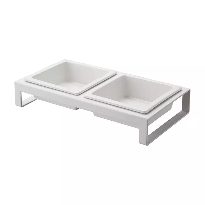 モダンでスタイリッシュな「タワー」シリーズは、シンプルさを活かしてどんな部屋にも調和するデザインが特長です。こちらは、ペットフードとお水や、2種類のフードなど、自由に組み合わせて使えるボウルとスタンドのセット。陶器製のボウルはスタンドから取り外しが可能なので、ごはんが終わったらサッと洗うことができ、いつでも清潔に保てます。また、フレームの床との接地面に滑り止めが付いているので、お皿がズレにくく食べやすい設計になっているのもポイントです。