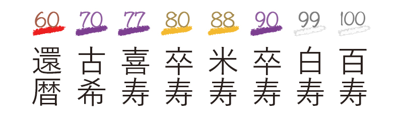 いわゆる「長寿祝い」には、60歳を迎えた方の記念行事である「還暦祝い」をはじめ、100歳の長寿をお祝いする「百寿」まで、合計8つのお祝いがあります。