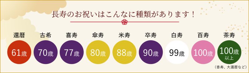 長寿祝いとは、60歳の還暦から100歳の紀寿/百寿まで、人生の節目を祝うものです。十二支・十支の干支が一回りする60年を元の暦に還る=還暦とします。昔は現在よりも寿命が短かったことから、60歳も長寿とされて盛大に祝っていたのです。