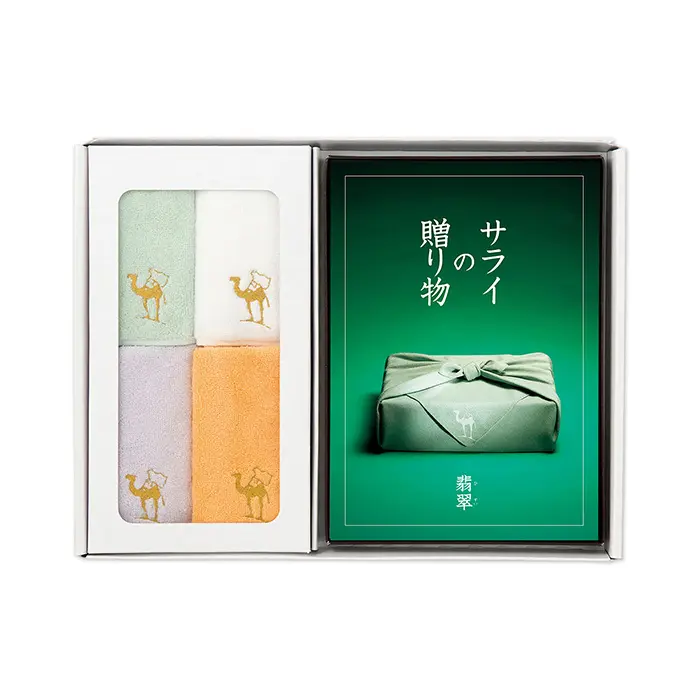 目上の方への贈り物に適したカタログ『サライ×リンベル サライの贈り物』と、オリジナルタオルハンカチがセットになった贈りものです。4枚セットのオリジナルタオルハンカチには、サライのロゴである駱駝マークの刺繍が入れられています。タオルハンカチには消臭機能を結合させた綿「タツロンα」を使用しており、何度洗濯しても消臭力が低下しません。