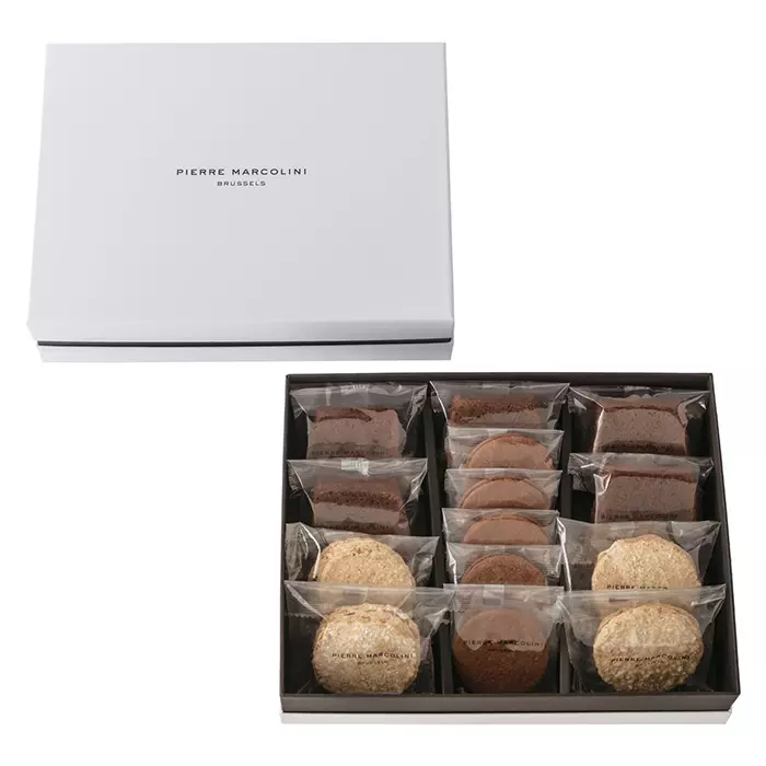 多彩な創造力をもつショコラティエ、ピエール・マルコリーニの魅力を気軽に味わえるパティスリーセレクション。オリジナルクーベルチュールを使用したシンプルな「チョコレートケーキ」、さっくりとした食感のカカオサブレにビターチョコレートをサンドした「サブレショコラ」、ヘーゼルナッツ風味の生地にチョコレートクリームをサンドした「ダックワーズ」といった焼菓子の定番3種類を詰め合わせました。