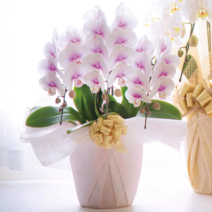 「幸せが飛んでくる」という花言葉の胡蝶蘭。特別なお祝いや、人生の節目を彩る高級花としてもお馴染みですが、その品種は実に多彩です。群馬県の中でも穏やかな気候の妙義山麓にある「マルイ洋蘭」は、年間約20品種、15万株もの栽培を手がける胡蝶蘭のスペシャリスト。常に新しい品種の開発にチャレンジし、個人で楽しめるサイズや、生花店では見られない珍しい胡蝶蘭がたいへん人気です。産地直送ならではの、新鮮かつ安定した品質の高さで、リピート注文する目利きの方も多いそう。開花期間もとても長く、上手に管理すれば何度も美しい花を付けてくれると評判です。
