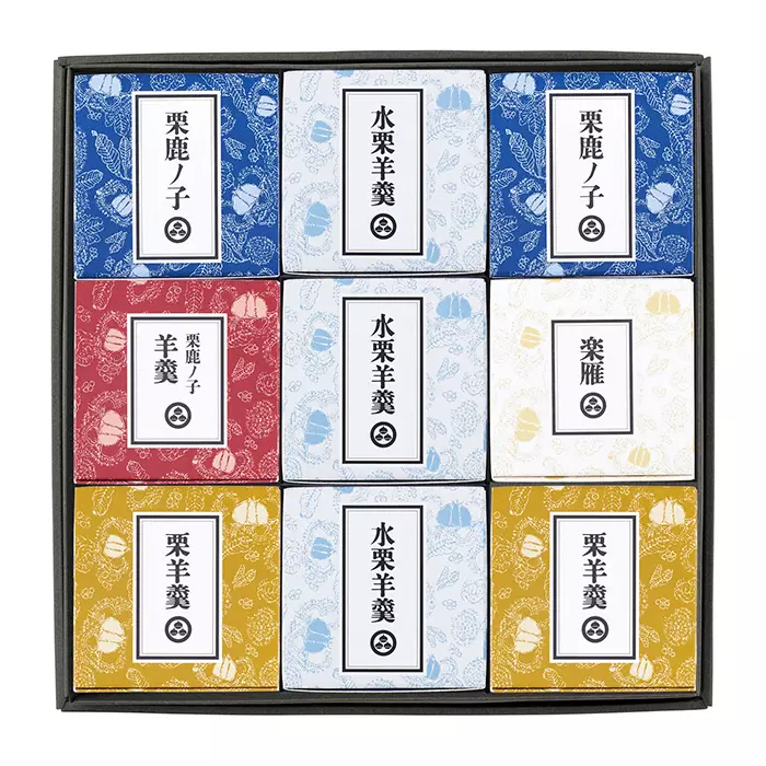 さらっと口どけのよい水栗羊羹、自社工場で仕込んだ栗あんと栗粒を合わせた栗鹿ノ子、栗あんだけを使った栗羊羹、栗羊羹に栗粒を加えた栗鹿ノ子羊羹、なめらかな食感で、香ばしい風味の楽雁の詰め合わせです。