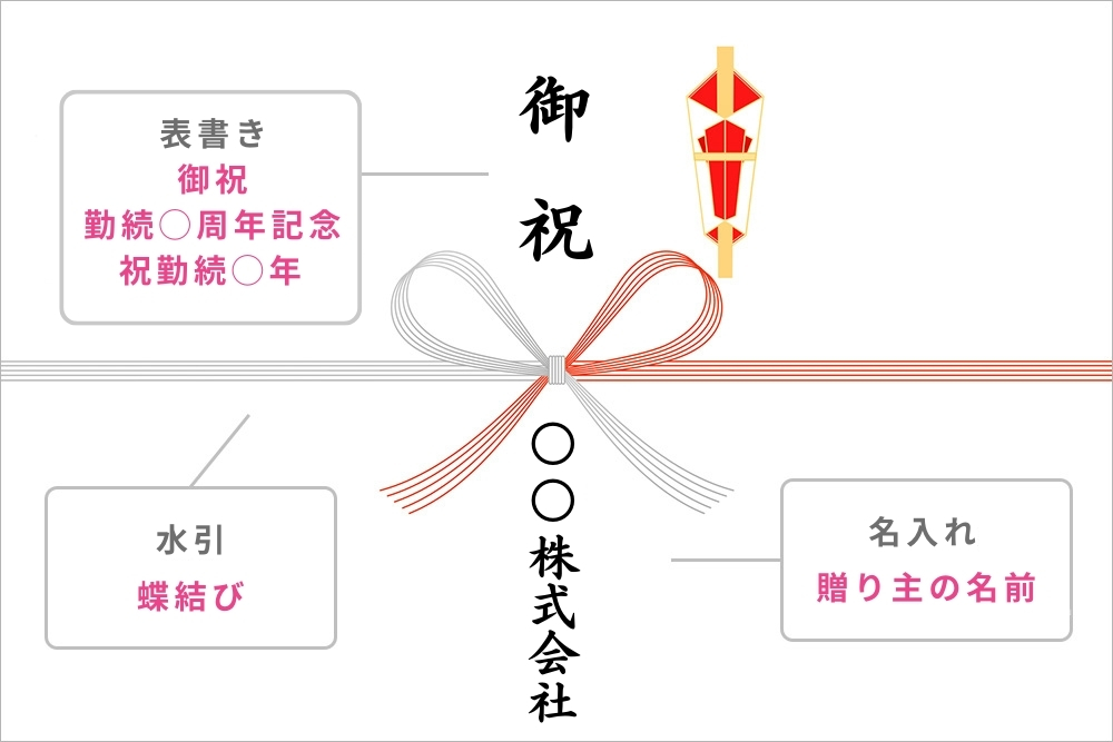 表書きは「御祝」「勤続◯周年記念」「祝勤続◯年」とするのが一般的です。