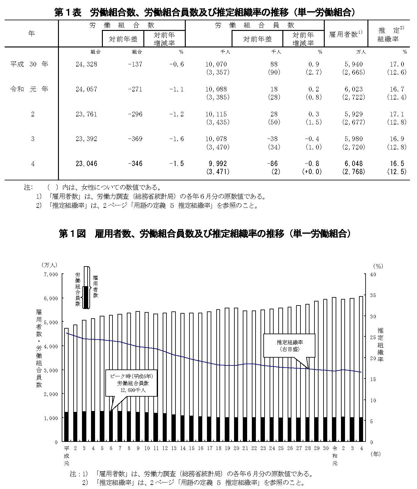 令和3年の時点で、労働組合の数が前年比で1.6%減少し、結果として推定組織率が17%を割るほど低下しています。労働組合は、従業員の労働環境改善や、企業側の健全性を担保するためにも重要なものであることが再認識されつつある一方、実態は大きく乖離し、労働組合の存在感が希薄なものになっていることがうかがえます。