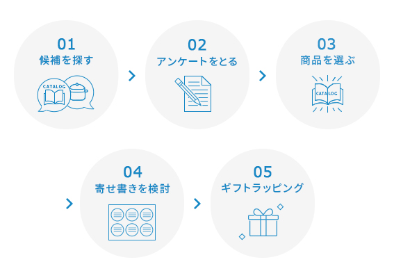 実際に贈るギフトを選定します。一緒に贈る方の意見を擦り合わせつつ、贈り先さまのことを考えたギフト選びを心がけましょう。実際に選定できたら、一緒に贈る方に報告をするのも大事なマナーです。