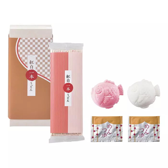 赤と白のうどんがぴったり寄り添った、結婚をお祝いするのにぴったりのギフト。赤と白の「めでタイ」最中を浮かべる華やかな仕様です。最中にはハート麩と乾燥ほうれん草が入っています。
