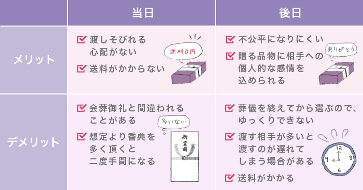 先述のとおり、香典返しを渡すタイミングには当日と後日という2つのパターンがあります。