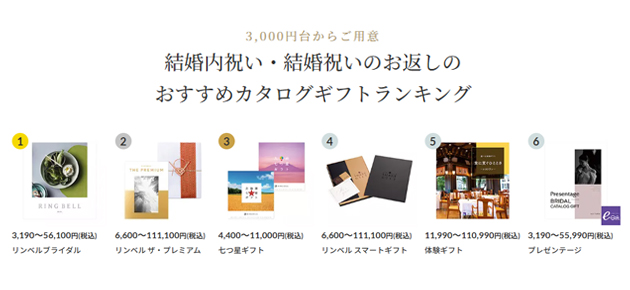 リンベルでは、結婚内祝いにふさわしいカタログギフトを、ご予算や贈るお相手に応じて、幅広くご用意しています。