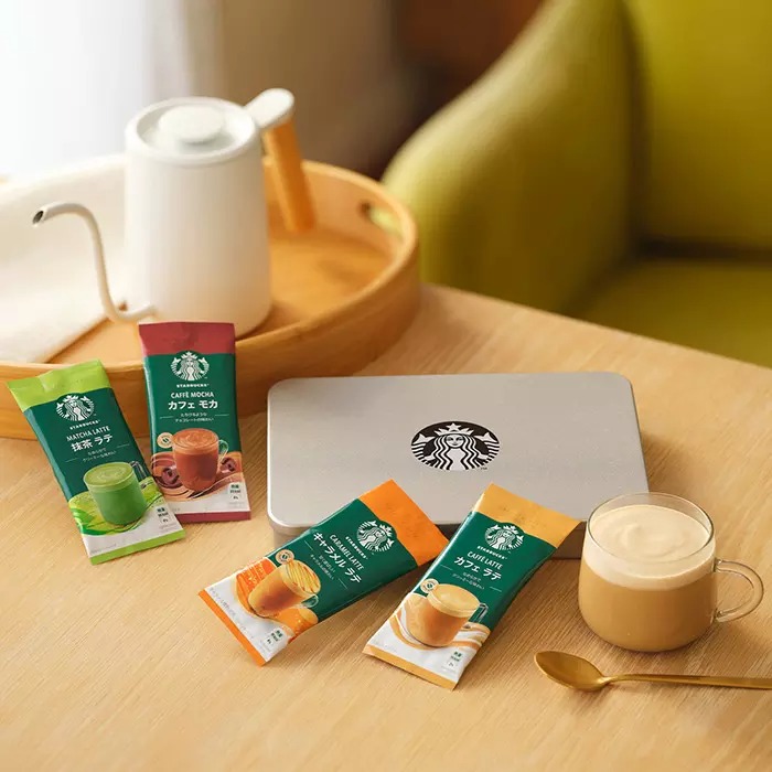 お湯を注ぐだけで、スターバックスのラテを自宅で楽しめるプレミアムミックスギフト。ロゴ入りのオリジナル缶に入っているので、ギフトとしての見映えも◎。