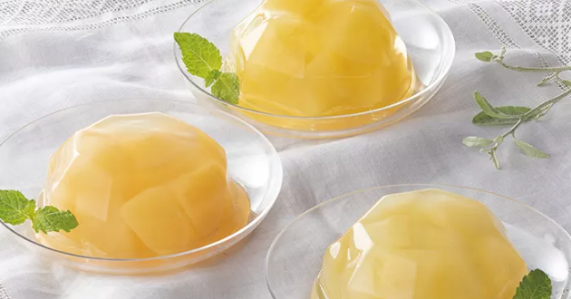 一番おいしい旬の時期に収穫したりんご、ラ・フランス、白桃をゼリーに閉じ込めました。国産フルーツを使用し、大ぶりにカットしたフルーツを、もちっとしたゼリーに包みました。まるでフルーツを食べているかのような果実感、暑い日には冷蔵庫でよく冷やしていただくと、また格別な味わいが楽しめます。
