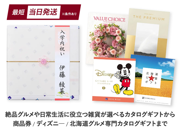 有名ブランドのグッズや人気店のグルメを掲載したものから、商品券やVISA・JCBなどのギフトカードを選ぶことができるものなど、贈る方やご予算に応じて豊富なカタログギフトのラインナップをご用意。最短当日発送で、お急ぎの方も安心です(※条件あり)。