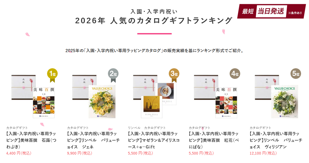 リンベルでは、入園・入学内祝い専用の特設ページをご用意。人気のカタログギフトをはじめ、マナーに配慮した“短冊のし対応商品”まで取り揃えています。