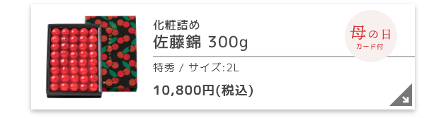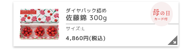 一般的に、さくらんぼの旬は6月からとされますが、リンベルでは母の日(5月10日)に間に合うさくらんぼをご用意しました。母の日専用オリジナルメッセージカードや、一部商品には専用パッケージを付けしてお届けいたします。