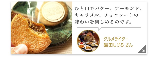 クッキー生地にキャラメルでコーテイングしたアーモンドスライスなどをのせて焼きあげます。豊かなバターの風味としっかり焼きあげられた生地の食感など、贅沢で濃厚な味を、ぜひ賞味ください。